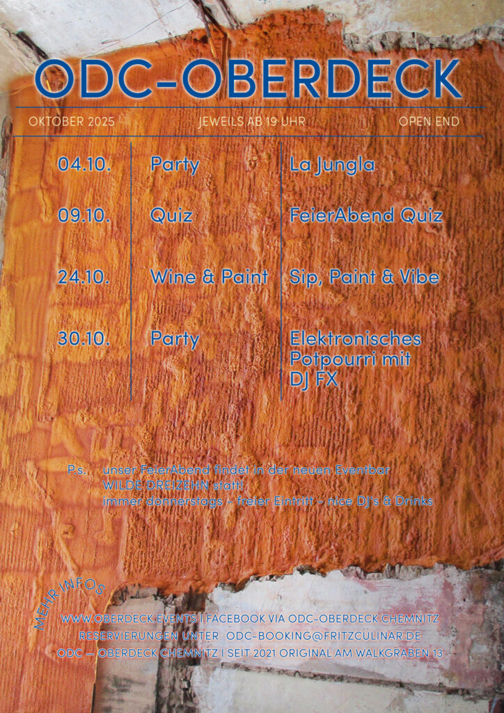 Das ODC-Oberdeck Chemnitz steht für erstklassige und ausgewählte Qualität bei der Kulinarik, Kultur, Gemeinschaft und für die Freude, das Leben zu feiern. Dieser Esprit lässt sich auch bei öffentlichen Veranstaltungen erleben. Du bist herzlich eingeladen Dich in entspannter Atmosphäre und bei einem netten Drink selbst davon zu überzeugen!